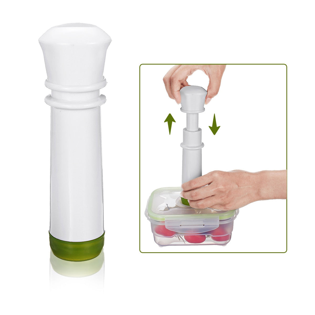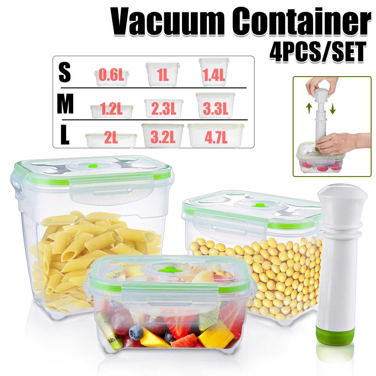 4 PC CONTAINERS: Handheld vacuum food storage containers. Pack includes (4) stackable and re-usable vacuum food containers (4) locking snap lids with latches: (2) 500ml/ 18 oz - L 5.5" x W 4.5" x H 3.0"; (2) 750ml/ 26 oz - L 5.5" x W 4.5" x H 4.3"; (1) Hand Held Pump - D 1.7" x H 4.5"